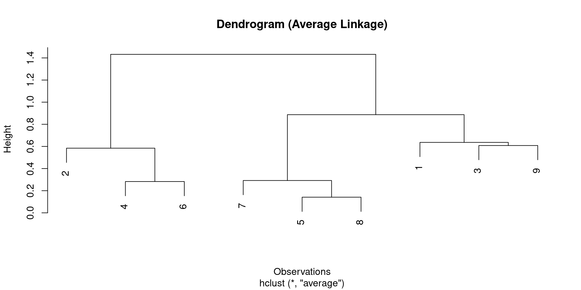 Average Linkage: Mean inter-cluster dissimilarity. Compute all pairwise dissimilarities between observations in cluster A and cluster B, and record the average of these dissimilarities.