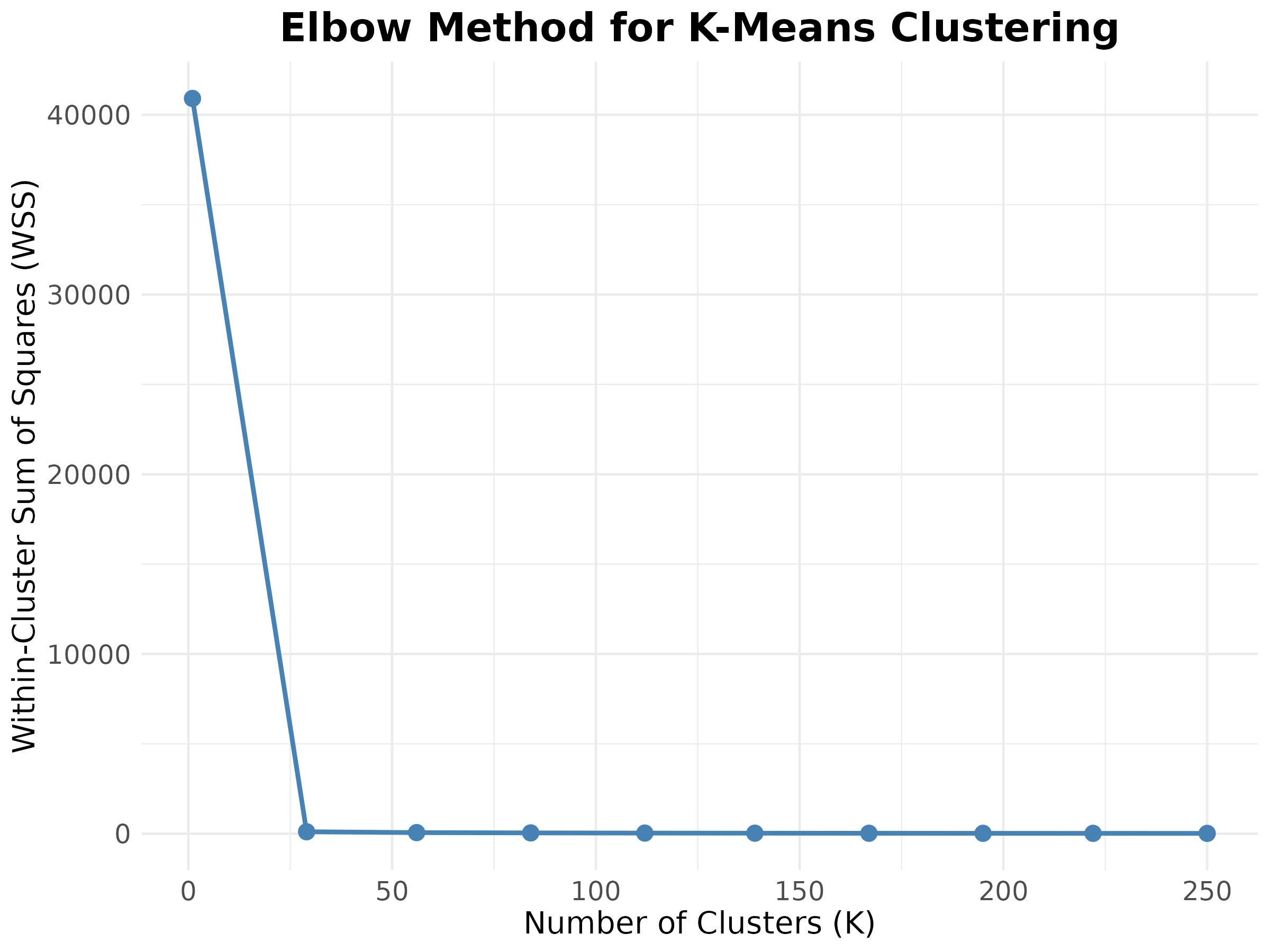 The most common choice for within-cluster variation is based on squared Euclidean distance: \[ W(C_k) = \frac{1}{|C_k|} \sum_{i,i' \in C_k} \sum_{j=1}^p (x_{ij} - x_{i'j})^2 \] where \(|C_k|\) denotes the number of observations in the \(k\)-th cluster.