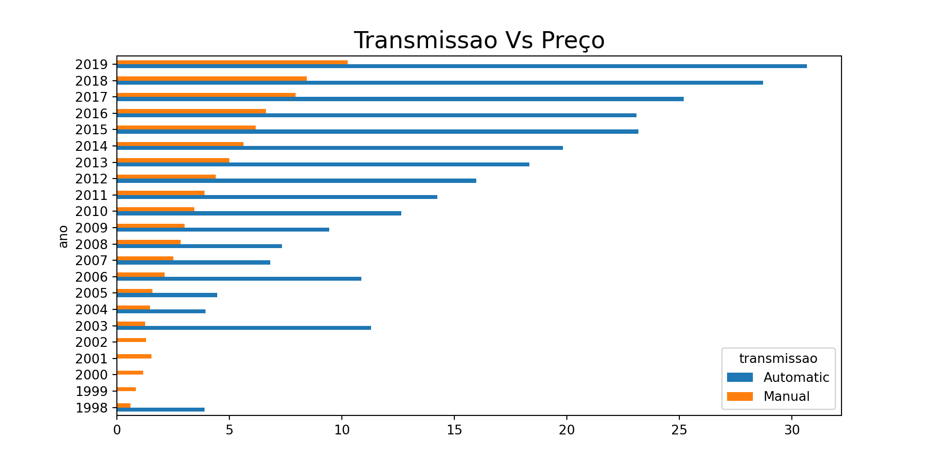dfp = dados.pivot_table(index='ano', columns='transmissao', values='preco', aggfunc='mean')