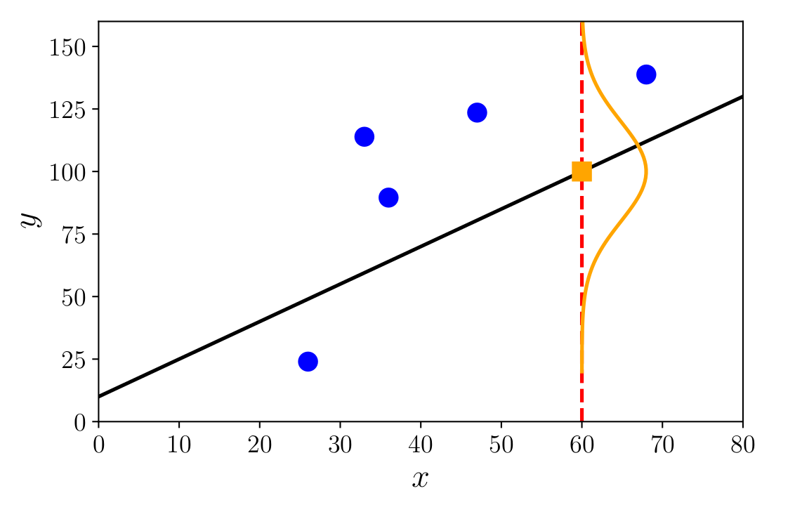 No exemplo abaixo, de uma regressão com ruído Gaussiano é assumido que o valor \(y_i\) segue uma distribuição normal centrada em \(\boldsymbol{\theta}^T \dot{\mathbf{x}}_i\),