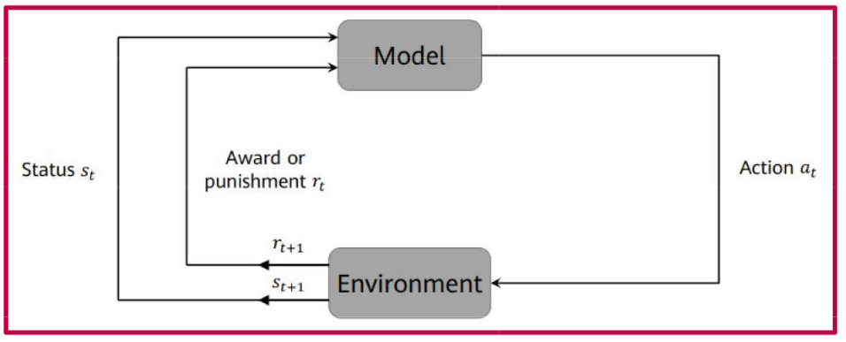 No lugar da amostra, temos uma sequência de ações que são tomadas em um ambiente, e o algoritmo aprende a melhor sequência de ações para maximizar uma recompensa.