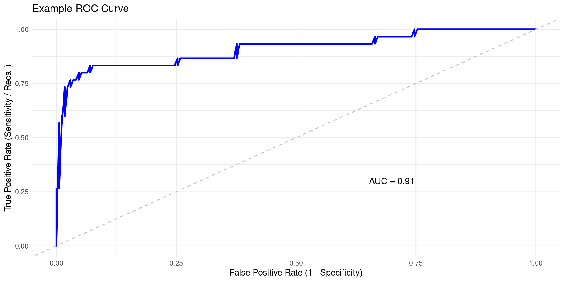 # Required libraries# install.packages(c("pROC", "ggplot2"))library(pROC)library(ggplot2)# --- Simulate Sample Data ---# Create true labels (y_true) and predicted probabilities (y_pred_prob)set.seed(42)n_samples <-200n_minority <-30# Imbalanced example# Actual binary outcome (factor is often preferred by pROC)y_true <-factor(c(rep("Minority", n_minority), rep("Majority", n_samples - n_minority)))# Predicted probabilities (higher for actual Minority class on average)y_pred_prob <-c(rnorm(n_minority, mean =0.7, sd =0.2),rnorm(n_samples - n_minority, mean =0.3, sd =0.2))# Ensure probabilities are within [0, 1]y_pred_prob <-pmax(0, pmin(1, y_pred_prob))# --- Calculate ROC Curve ---# Ensure 'Minority' is considered the positive class if needed: levels = c("Majority", "Minority")roc_obj <-roc(response = y_true, predictor = y_pred_prob, levels =c("Majority", "Minority"))# --- Calculate AUC ---auc_value <-auc(roc_obj)# --- Plot using ggplot2 ---# Extract points for plottingroc_data <-data.frame(fpr =1- roc_obj$specificities, # FPR = 1 - Specificitytpr = roc_obj$sensitivities # TPR = Sensitivity/Recall)# Create the plotggplot(roc_data, aes(x = fpr, y = tpr)) +geom_line(color ="blue", linewidth =1) +# ROC curvegeom_abline(intercept =0, slope =1, # Diagonal line (random guess)linetype ="dashed", color ="grey") +ggtitle("Example ROC Curve") +xlab("False Positive Rate (1 - Specificity)") +ylab("True Positive Rate (Sensitivity / Recall)") +# Add AUC value as text annotationannotate("text", x =0.7, y =0.3, # Adjust coordinates as neededlabel =paste("AUC =", round(auc_value, 3)), size =4) +theme_minimal() # Or theme_bw()