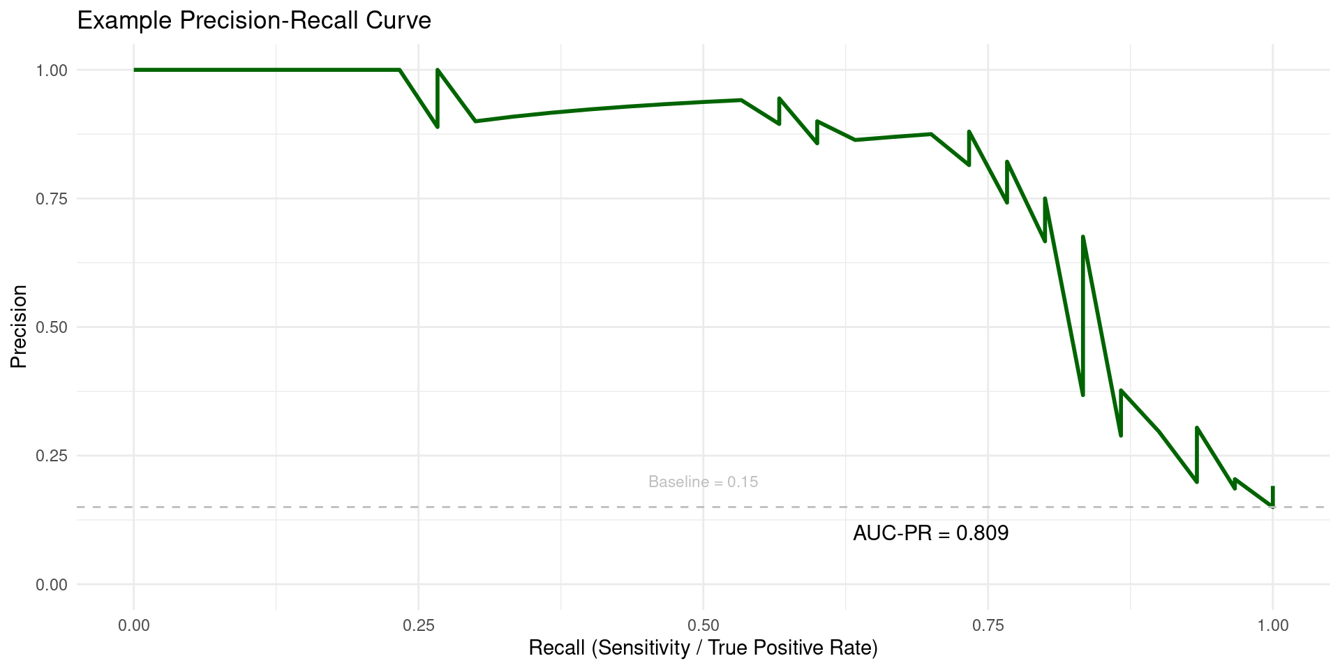 # Required libraries# install.packages(c("PRROC", "ggplot2"))library(PRROC)library(ggplot2)# --- Simulate Sample Data (same as ROC example for consistency) ---set.seed(42)n_samples <-200n_minority <-30# Imbalanced example# Actual binary outcome (numeric: 1 for positive/minority, 0 for negative/majority)y_true_num <-c(rep(1, n_minority), rep(0, n_samples - n_minority))# Predicted probabilities for the positive classy_pred_prob <-c(rnorm(n_minority, mean =0.7, sd =0.2),rnorm(n_samples - n_minority, mean =0.3, sd =0.2))# Ensure probabilities are within [0, 1]y_pred_prob <-pmax(0, pmin(1, y_pred_prob))# Separate scores for positive and negative classes needed by PRROCscores_pos <- y_pred_prob[y_true_num ==1]scores_neg <- y_pred_prob[y_true_num ==0]# --- Calculate PR Curve ---# curve = TRUE calculates points for plottingpr_obj <-pr.curve(scores.class0 = scores_pos, scores.class1 = scores_neg, curve =TRUE)# --- Calculate Baseline ---baseline_precision <- n_minority / n_samples# --- Plot using ggplot2 ---# Extract points from the PRROC object (Recall, Precision, Threshold)pr_data <-as.data.frame(pr_obj$curve)colnames(pr_data) <-c("Recall", "Precision", "Threshold")# Create the plotggplot(pr_data, aes(x = Recall, y = Precision)) +geom_line(color ="darkgreen", size =1) +# PR curve# Add baseline (random guessing)geom_hline(yintercept = baseline_precision, linetype ="dashed", color ="grey") +ggtitle("Example Precision-Recall Curve") +xlab("Recall (Sensitivity / True Positive Rate)") +ylab("Precision") +# Add AUC-PR value (available in pr_obj$auc.integral)annotate("text", x =0.7, y =0.1, # Adjust coordinateslabel =paste("AUC-PR =", round(pr_obj$auc.integral, 3)), size =4) +annotate("text", x =0.5, y = baseline_precision +0.05, # Label baselinelabel =paste("Baseline =", round(baseline_precision, 3)), size =3, color ="grey") +scale_x_continuous(limits =c(0, 1)) +# Ensure Recall axis is 0-1scale_y_continuous(limits =c(0, 1)) +# Ensure Precision axis is 0-1theme_minimal() # Or theme_bw()# To just print AUC-PR: print(paste("AUC-PR:", pr_obj$auc.integral))