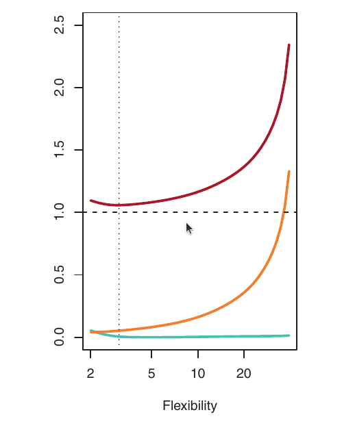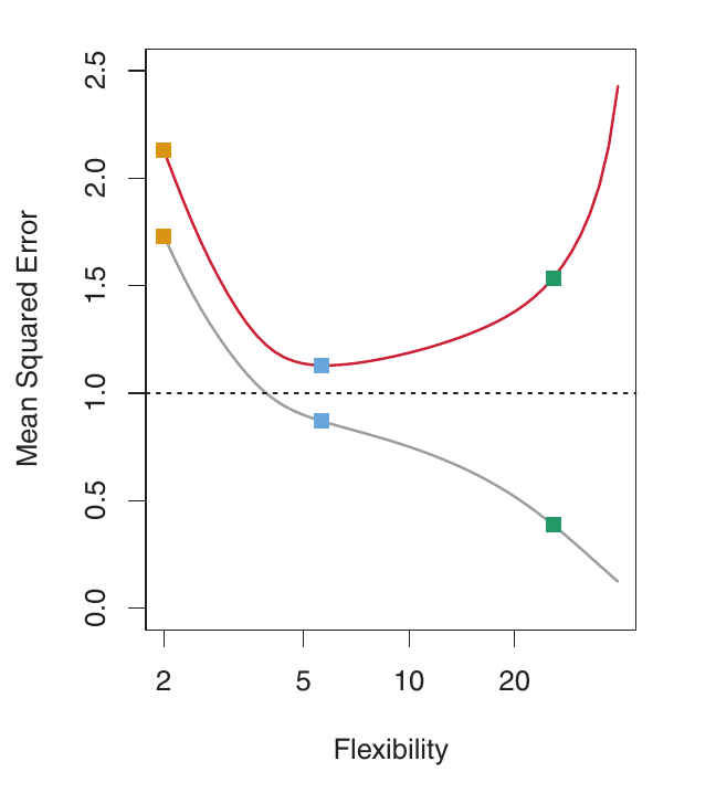 The green curve is the most flexible – it fits the training data very well, but it’s too wiggly and poorly estimates the true f (black curve). This is overfitting. The model is capturing noise, not just the underlying signal.