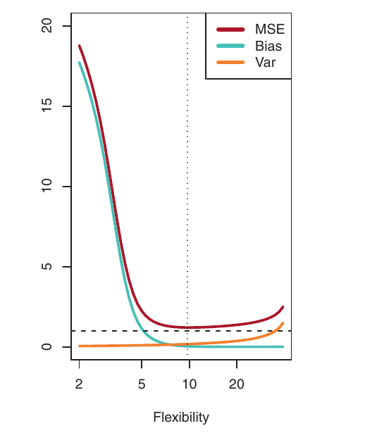 The U-shape observed in the validation MSE curves (Figures below) is a result of two competing properties of statistical learning methods: bias and variance.