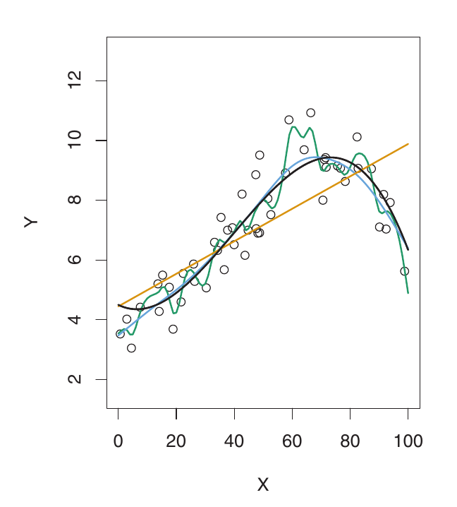 Left: Simulated data. Black curve is the true f. Orange: linear regression. Blue & Green: smoothing splines with different flexibility.