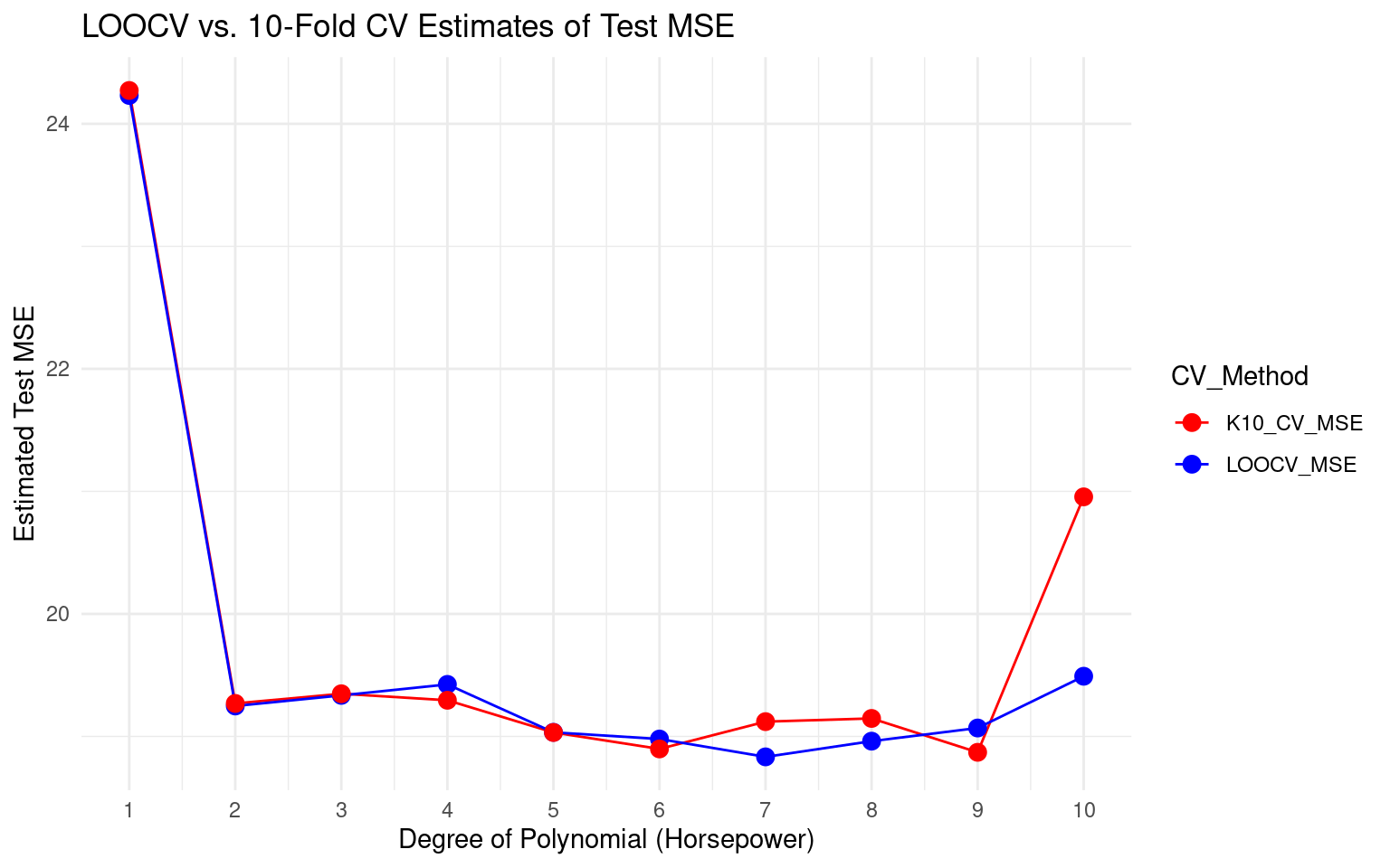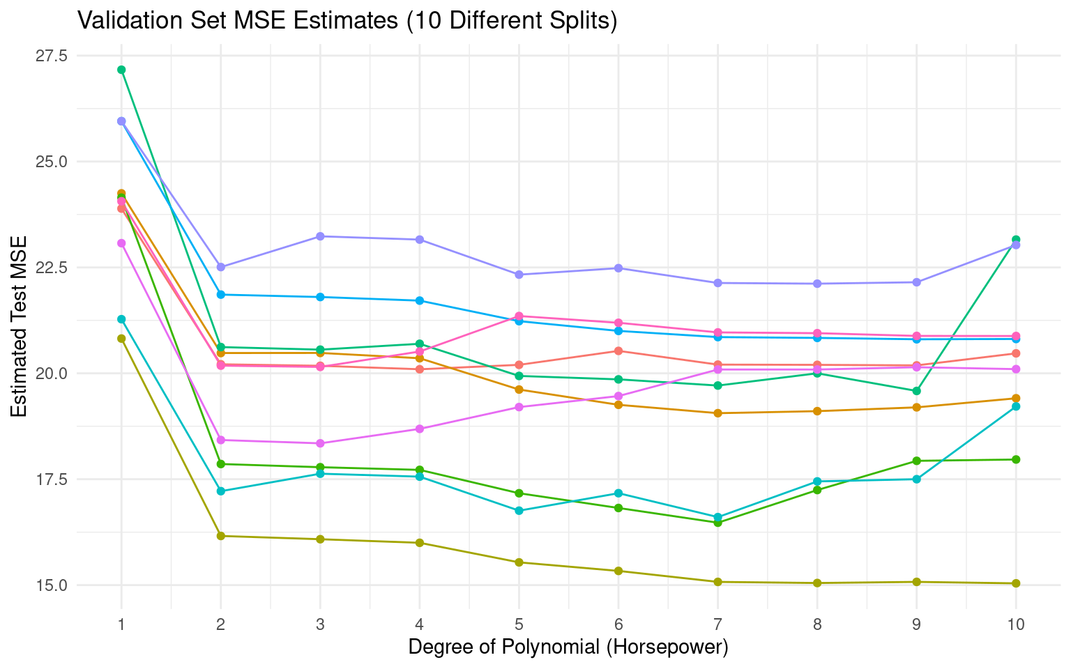 n_repeats <-10mse_results <-matrix(NA, nrow = n_repeats, ncol =10) # Store MSEs for degrees 1-10for (rep in1:n_repeats) {set.seed(rep +10) # Different seed each time train_idx_rep <-sample(n, round(.7*n), replace = F) train_dt <- Auto[train_idx_rep,] test_dt <- Auto[-train_idx_rep,] # Validation set contains observations NOT in train_idxfor (degree in1:10) { lm_fit_rep <-lm(mpg ~poly(horsepower, degree), data = train_dt) pred_rep <-predict(lm_fit_rep, test_dt) mse_results[rep, degree] <-mean((test_dt$mpg - pred_rep)^2) }}# DataFrame with MSEmse_df_long <-as.data.frame(mse_results)names(mse_df_long) <-1:10mse_df_long$Repeat <-1:n_repeatsmse_df_long <- tidyr::pivot_longer(mse_df_long, cols =-Repeat, names_to ="Degree", values_to ="MSE")mse_df_long$Degree <-as.integer(mse_df_long$Degree)