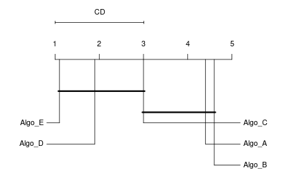 Critical Difference (CD): The minimum difference in average ranks required to declare a statistically significant difference at a chosen significance level \(\alpha\).