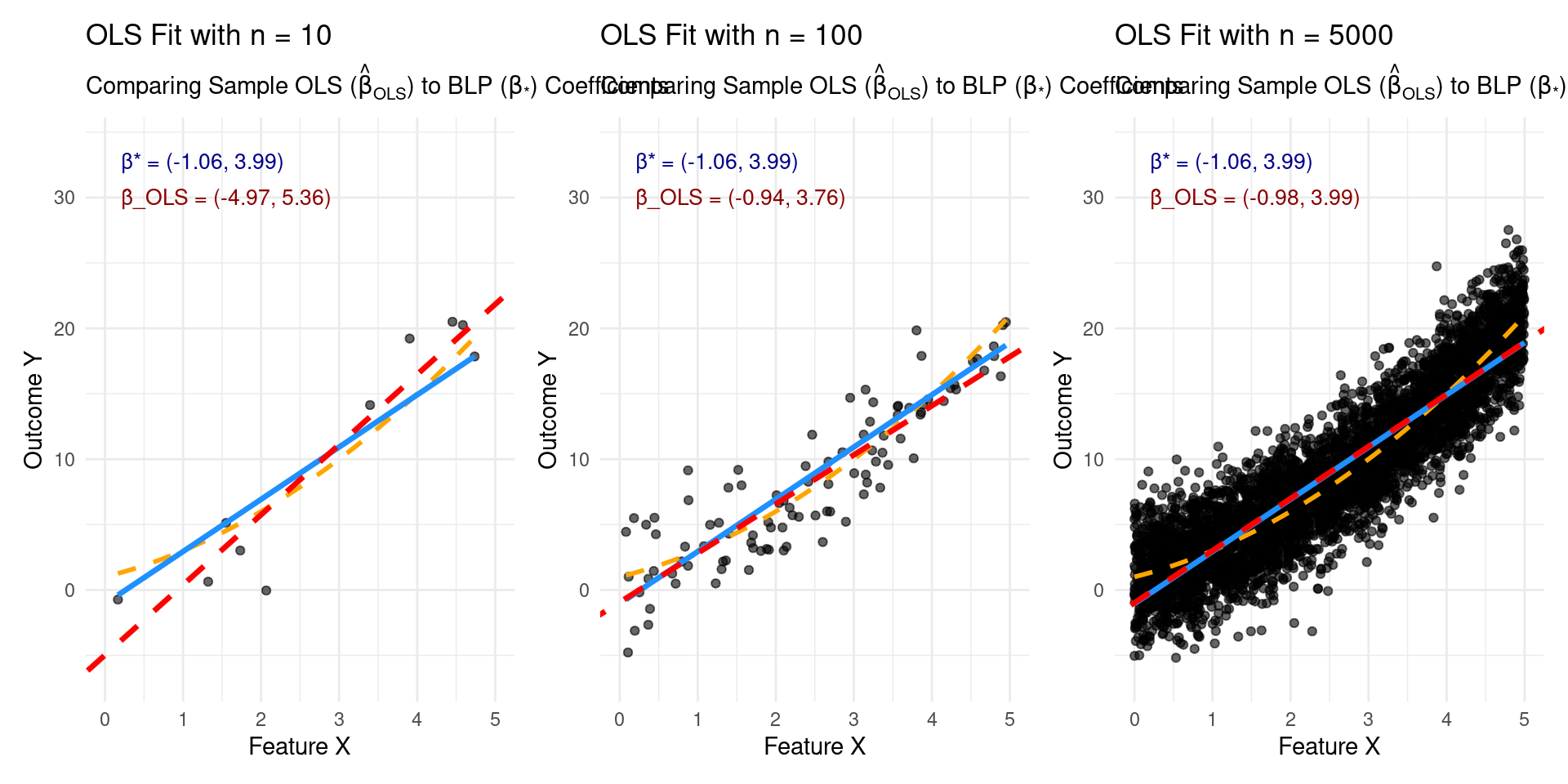 Key Insight: OLS converges to \(\boldsymbol{\beta}_*\), the parameters of the Best Linear Predictor.