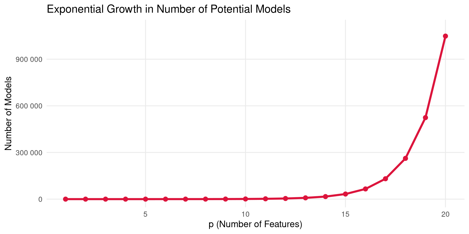 A plot showing the number of possible subset models (\(2^p\)) versus the number of predictors (\(p\)). The number grows exponentially, rapidly exceeding millions even for modest \(p\) (e.g., \(p=20\)).