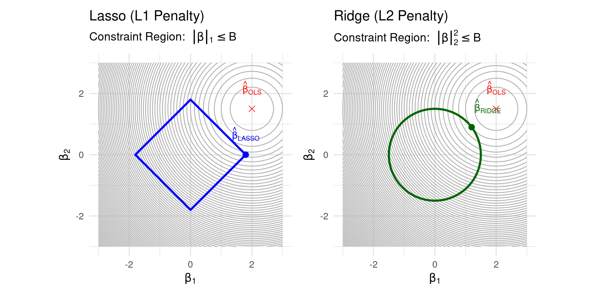 Lasso (L1): Constraint \(||\boldsymbol{\beta}||_1 \le B\) is a diamond (in 2D). The corners of the diamond lie on the axes. The RSS ellipse is more likely to make its first contact with the diamond constraint region at a corner, implying one coefficient is zero.