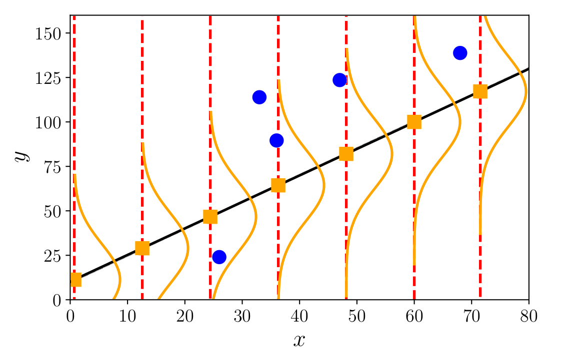 No exemplo abaixo, de uma regressão com ruído Gaussiano é assumido que o valor \(y_i\) segue uma distribuição normal centrada em \(\boldsymbol{\theta}^T \dot{\mathbf{x}}_i\),