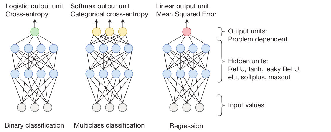 Podemos ter em geral 3 tipos de saídas de uma rede neural fully conected: