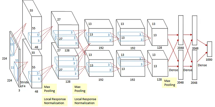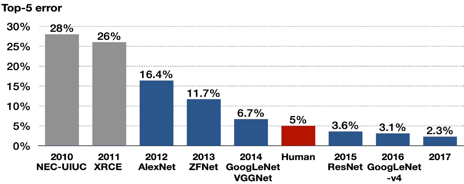 Em 2012, a equipe da Universidade de Toronto, liderada por Alex Krizhevsky, Ilya Sutskever e Geoffrey Hinton, desenvolveu uma CNN chamada AlexNet (paper), que obteve uma precisão de erro de 16,4%, superando significativamente os métodos tradicionais e significativamente melhor que o segundo colocado do mesmo ano, que teve uma taxa de erro de 26,2%.