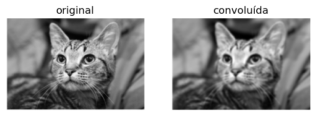 em que \(f\) é a imagem de entrada, \(g\) é um filtro, \(S\) é a matriz resultante da convolução, \(*\) é o operador de convolução. Nesse caso, \(S\) e \(f\) são matrizes com \(N\) linhas e \(M\) colunas, e \(g\) é um filtro com \(n\) linhas e \(m\) colunas.