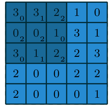 \(S(0,0) = (0 \cdot 3) + (1\cdot3) + (2\cdot2) + (2\cdot0) + (2\cdot0) + (0\cdot1) + (0\cdot3) + (1\cdot1) + (2\cdot2) = 12\)