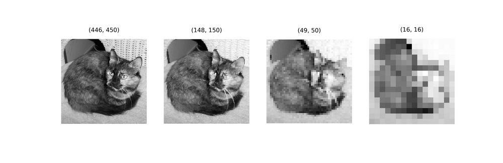 Na primeira linha, imagem de referência através de 3 iterações progressivas de max pooling usando um kernel de (2, 2). Na segunda linha, a imagem de referência através de 3 iterações progressivas de average pooling usando um kernel de (3, 3).