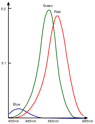 A luz azul é menos prevalente na luz natural e ambiente em comparação com a luz vermelha e verde.