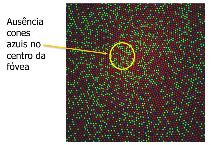 A proporção desigual de cones vermelhos, verdes e azuis permite um equilíbrio entre a acuidade visual, a percepção de cores e a minimização de distorções ópticas.