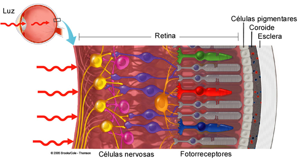 Onde células fotossensíveis iniciam sua transformação em sinais elétricos que a transformarão em visão.