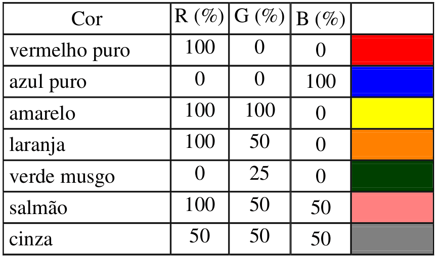 Cores criadas com o vetor cromático R,G,B
