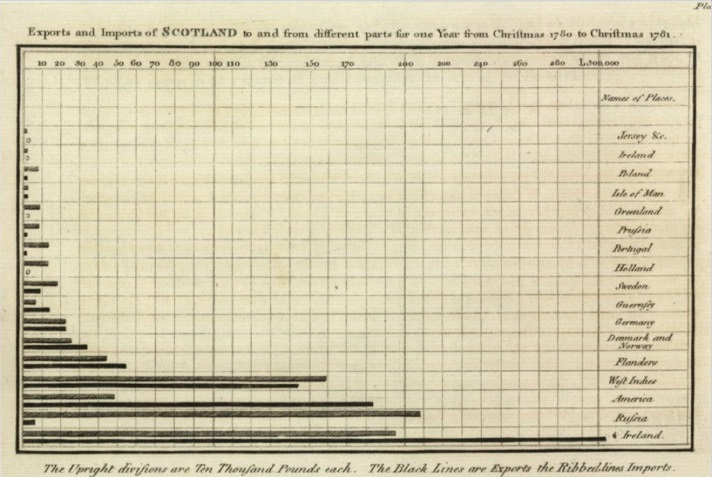 Gráfico de barras horizontais da balança comercial inglesa, em 1781, por Playfair.