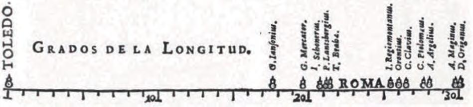 Gráfico unidimensional de estimativas longitudinais, em 1644, por Van Langren.