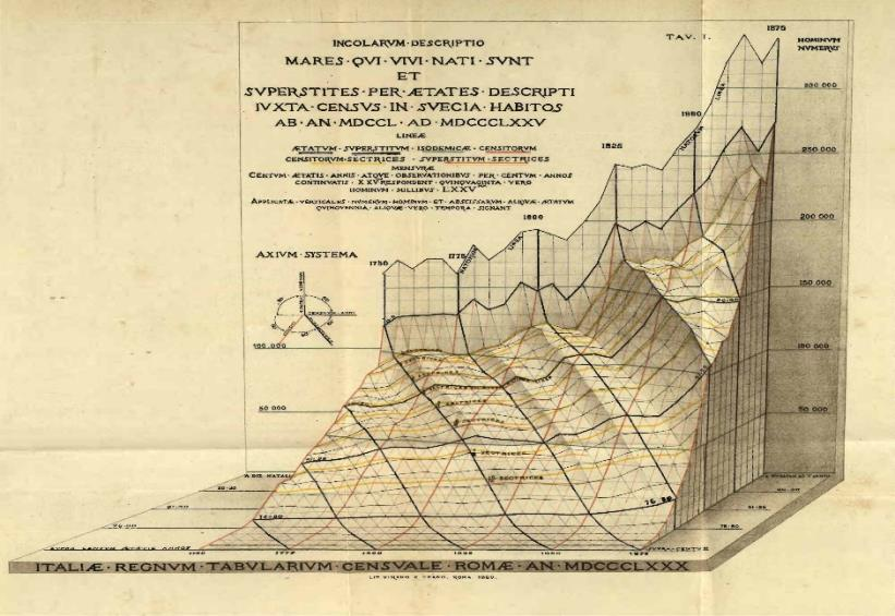 Foi nesse contexto que Luigi Perozzo introduziu, em 1879, o primeiro gráfico de três dimensões de que se tem notícia: