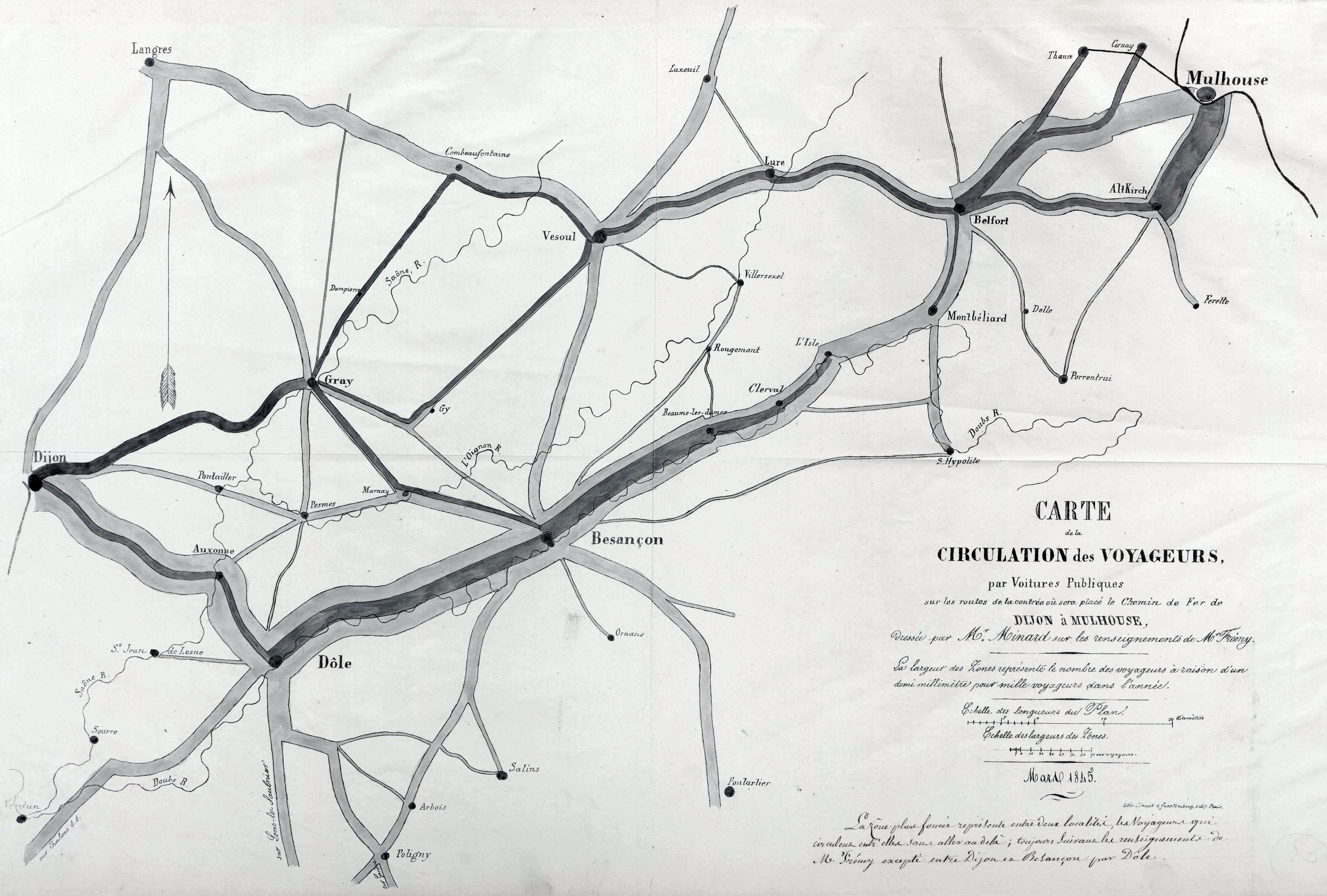 Mapa de fluxo de tráfico no Leste da França, em 1845, por Minard.