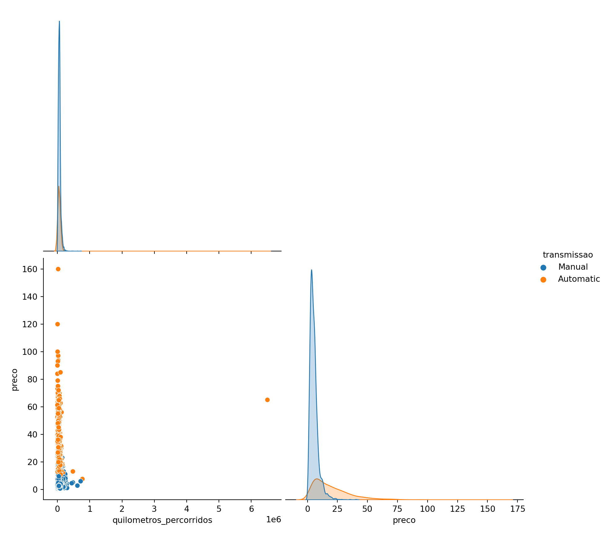 sns.pairplot(data=dados[['quilometros_percorridos','preco','transmissao']], \