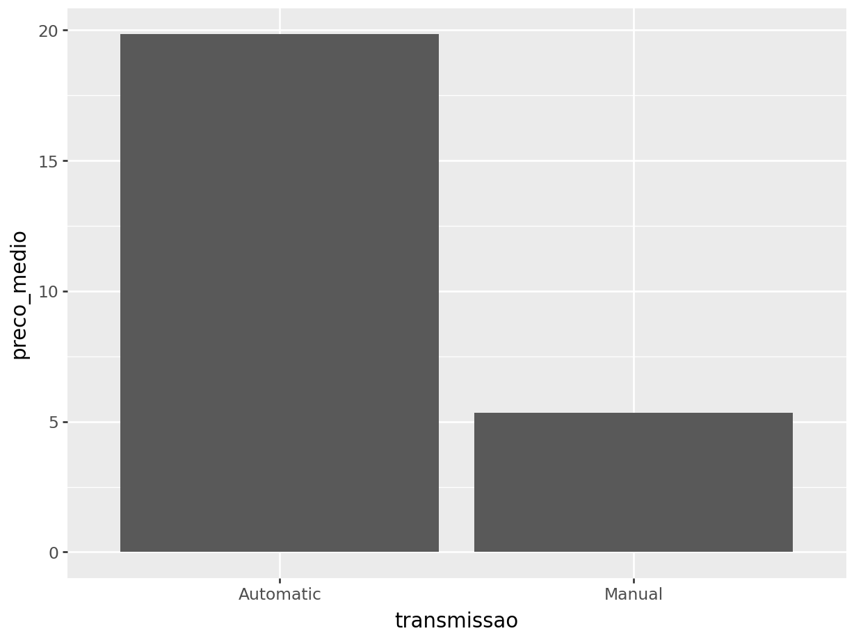ggplot(dados_agrupados_p, aes(x = 'transmissao', y = 'preco_medio')) \
