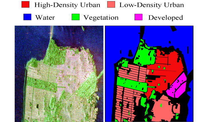 The algorithms were used to classify the PolSAR data intensities of the regions of a well-known PolSAR dataset: the San Francisco Bay region.