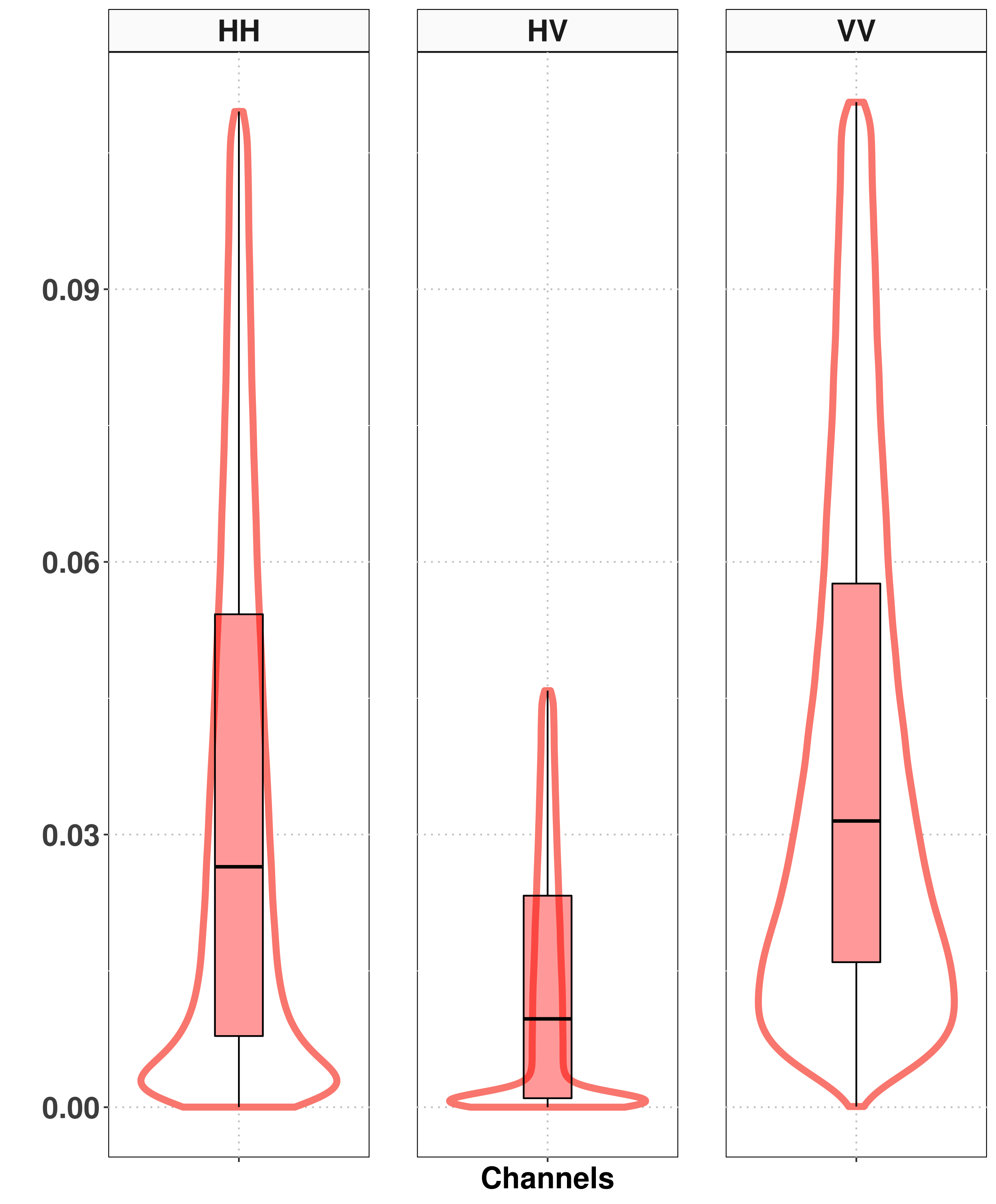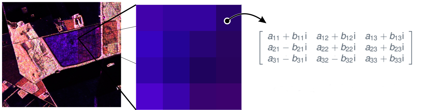 where \(|\cdot|\) is the determinant of a matrix or absolute value of a scalar, \((\cdot)^{*}\) is the conjugate transpose of a vector, and \(\mathbf{\Sigma}\) is the positive definite Hermitian covariance matrix that contains all necessary information to characterize the polarimetric return of the data under analysis.