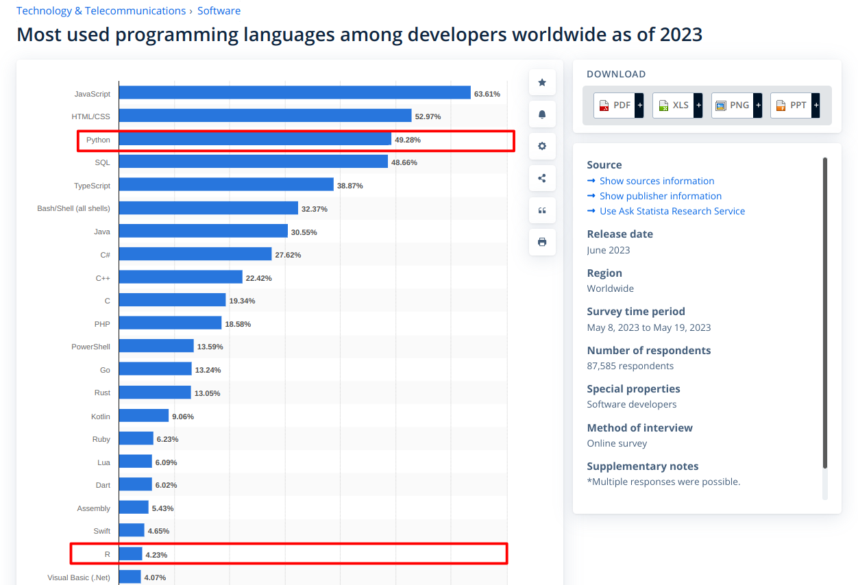 É uma das linguagens mais utilizadas em desenvolvimento de software e análise de dados.;